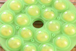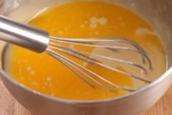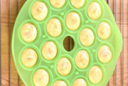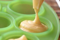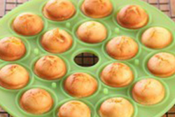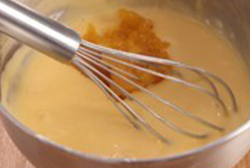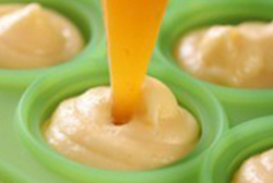 6 剩余50g菠萝酱装入裱花袋中,减小小的口,插入糊糊里挤入果酱