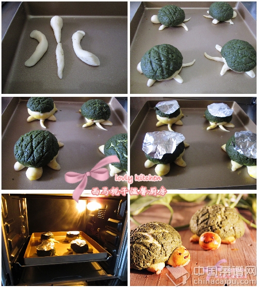 温馨小贴士:做抹茶酥皮的时候,如果太干可以适量添加一些牛奶。烘烤的时候在每个小龟上盖上锡纸,以免在烘烤过程中上色太深,影响美观。