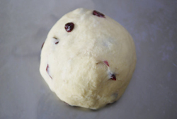 取出发酵好的面团,排气按扁,将温水泡软并沥干的蔓越莓铺在面团上,反复折叠使蔓越莓均匀分布在面团中,滚圆备用。