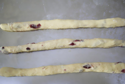 把圆柱形面团分别搓成同样长度的长条形,三长条为一组。