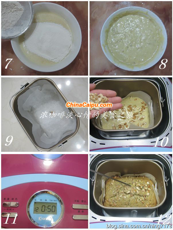 10.将面包机桶放入面包机中,倒入拌好的蛋糕糊,在表面撒上杏仁碎。