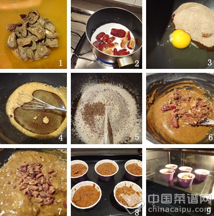 原料:干红枣40g、水40g、酸奶40g、小核桃仁20g、鸡蛋2个、红糖40g、色拉油65g、低粉90g、牛蒡干(磨成粉)20g、苏打粉1/4小勺、泡打粉1/2小勺