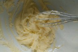 黄油加入糖打发至体积蓬松 颜色略变浅