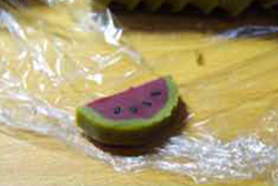 10 冻硬后取出切片,再中间切一刀,形成半圆的西瓜状