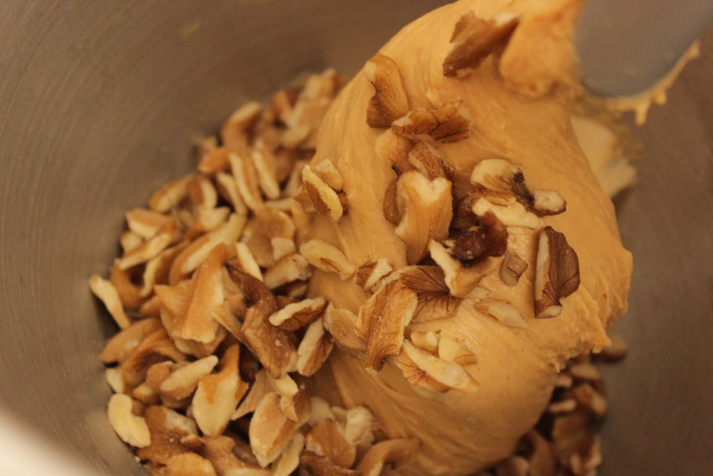 3 揉到扩展阶段后加入核桃再用慢速搅拌至均匀,约一分钟,然后把面团进行基础发酵