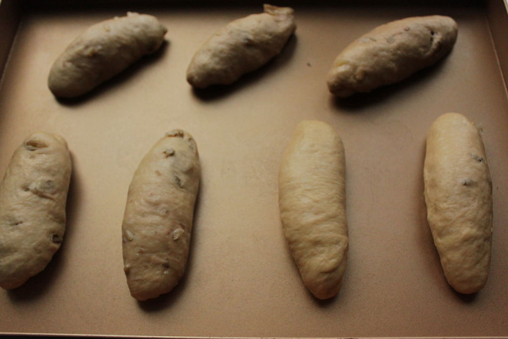 5 松弛后的面团擀成椭圆形卷成橄榄形.将面团排在烤盘上,放温暖湿润处进行最后发酵