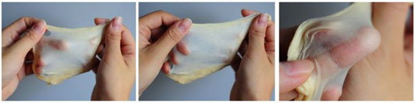图5图6是让大家看看完全阶段的膜,很多人不太清楚完全阶段的膜是什么样子。其实我是不太推荐大家套在手上测试膜的,根本不需要拉那么大,还浪费时间,自己扯一块面团下来拉拉看就知道了,膜关键是要有韧性,不容易戳破,完全阶段的膜能看到自己的指纹。