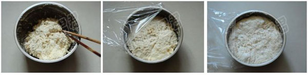 1、先做冷藏液种面团:酵母用300g温水化开,和高粉混合,用筷子搅匀即可