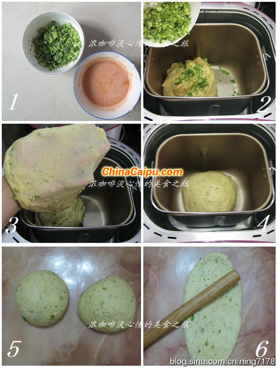 2.胡萝卜汁、牛奶、全蛋、绵白糖、盐、金像面包粉、酵母4.5克依次放入面包机中,开启和面程序搅拌20分钟后,加入室温软化的黄油,再继续搅拌15分钟后,加入西兰花碎再搅拌5分钟,共计揉面40分钟。