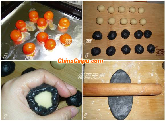 水油皮:面粉100g、猪油30g、温水40g、白糖5g、盐5g、竹炭粉1g