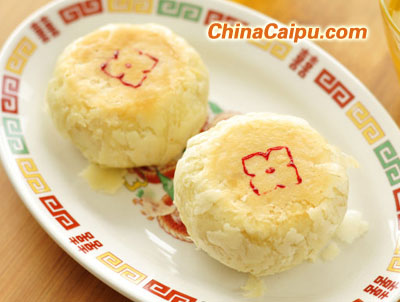 6.开始包酥。取一个小的水油面团压平,上面放一个小的油酥面团