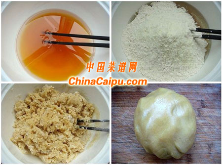 1、转化糖浆中加入枧水,搅打均匀。再加入油,搅打均匀后,加入盐,搅拌均匀,最后筛入面粉,拌匀,揉合成面团,覆盖保鲜膜,松弛两小时以上。