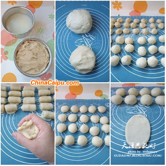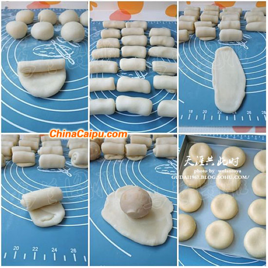 11 取一个小面团擀成圆皮,包入白豆沙馅,收口朝下捏紧