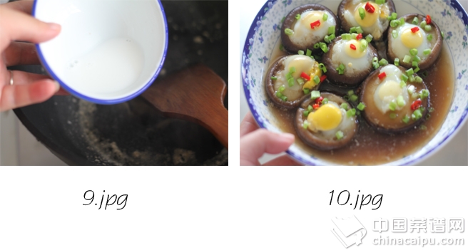 10:勾芡好的汤汁倒在蒸好的香菇上,撒上切碎的小葱,和红椒即可。