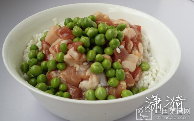 2-4、泡好的糯米、五花肉、豌豆混合在一起,放入生抽、糖、鸡精,一点点老抽调色