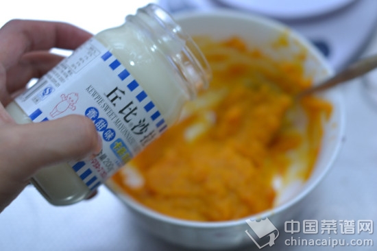 5.南瓜和紫薯泥中各加入一大勺丘比沙拉酱(香甜型)