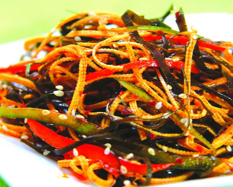均切成细丝。锅内放油、盐、姜、葱和辣椒烹调;加入海带猛火炒,然后放入适量的味精、酱油、醋、糖和香油翻炒,即可出锅。此菜具有脆嫩爽口的特点。