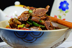 将煮好的鸡胗切片,青椒、红椒、香葱改刀