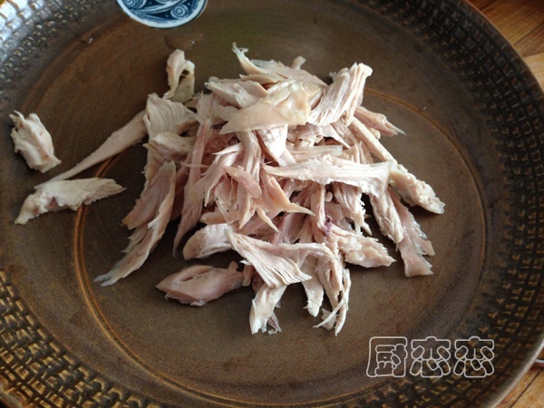 煮熟后的鸡肉顺着鸡肉的纹理撕成丝(这样撕得丝会比较的细长),放在盘子里