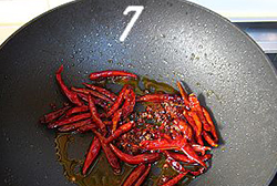 炒锅倒油烧热,放入干辣椒和花椒粒炒出香味。