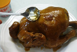 把整鸡放进锅中,加盖中火煮开,隔几分钟就把鸡翻转一次,让鸡身各部位都着色入味,煮20分钟。