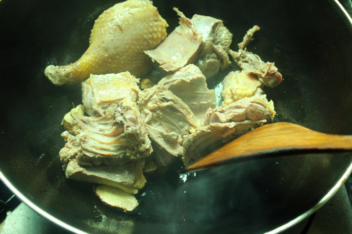 锅内倒入适量清水,水沸以后倒入老鸭块