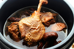 将锅中的老鸭连同汤汁倒入电砂锅内,加盖,焖煮2个半小时