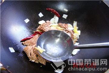 3.出辣味和麻味后,放入姜蒜片,泡椒,泡姜(葱先不要放)。