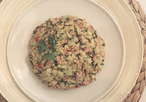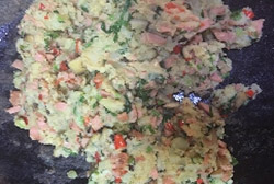 6 倒入土豆泥,反复按压、翻炒;.最后加入香菜、葱、小米椒,继续翻炒,加入盐、味精、即可起锅