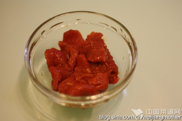 1、牛肉切片用油、黑椒酱、和玉米淀粉腌制。