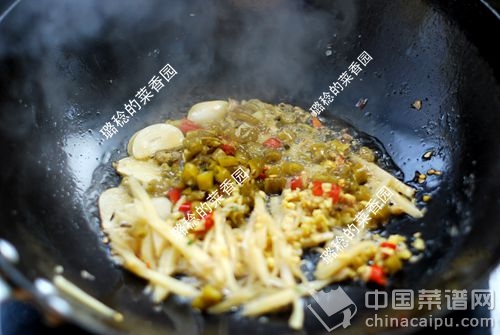 6、嫌味道不够浓烈,再挖上一大勺剁椒酱(也可换成郫县豆瓣酱,根据个人喜好)进去一起炒,炒出红油并出香。