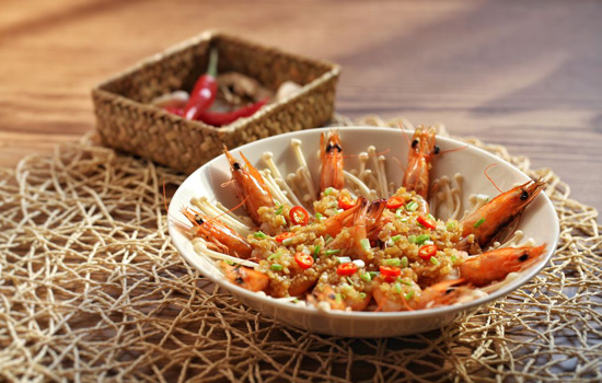 海鲜之所以叫海鲜,就因为它的鲜味充足。虾作为海鲜之一,是我们日常生活中常用到的食材。海鲜来自大海所以有一种海产品特有的腥味,如果要做的好吃,蒜是少不了的。这盘蒜蓉蒸虾鲜气四溢,汤汁又被底下的金针菇完美的吸收,一点也不浪费!