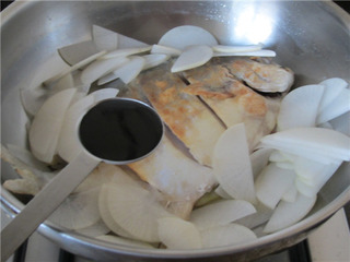 7 加入鲳鱼和萝卜片,同时加入酱油;