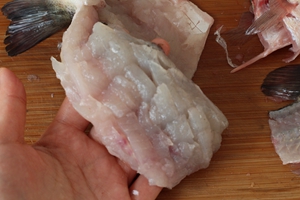 4 在片好的鱼肉上切花刀,先直切,然后再斜切,不要将鱼皮切断
