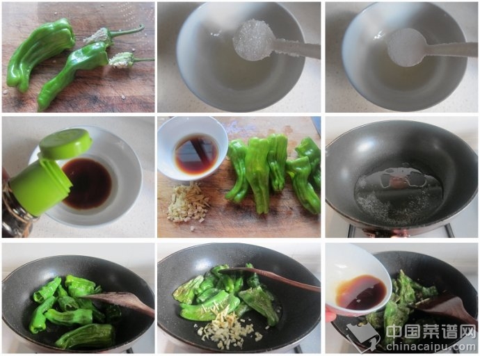 材料:青椒8个,米醋、酱油、糖、盐、姜蒜、植物油。