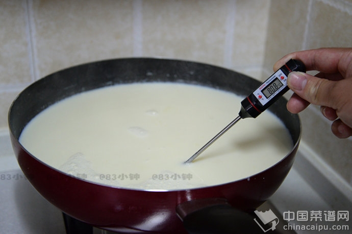 7.关火,让煮开的豆浆自然晾至80-85度左右。或者,倒入约为豆浆总量20%的凉白开给豆浆迅速降温。(家里没有温度计的话,建议直接用凉白开给豆浆降温,300克黄豆+2700克清水磨出来的豆浆,我直接关火加了600ml凉白开,搅匀后测出的温度是80.8)