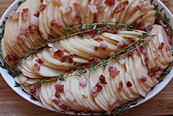 再铺上培根丁,在周围和土豆间隔处摆上百里香,再撒上盐和胡椒粉,入烤箱即可