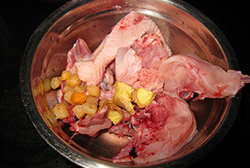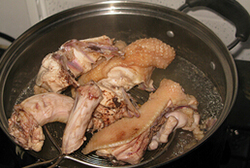 取锅注入适量清水煮沸,放入鸡骨架略煮,捞出;用流动水清洗去血沫