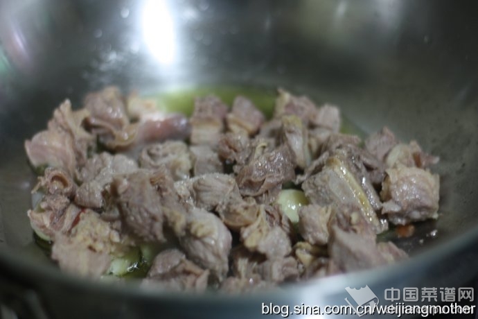 2、炒锅放橄榄油爆香姜蒜,加入牛腩块爆炒。