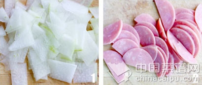 6.放入火腿片,洗净的小油菜,煮半分钟。放入盐、鸡精、白胡椒粉、香油,搅匀即可盛出