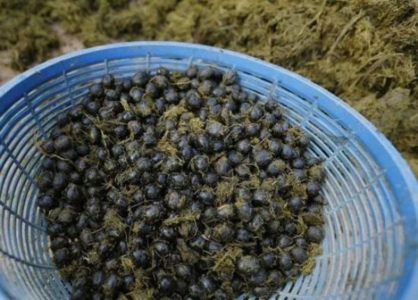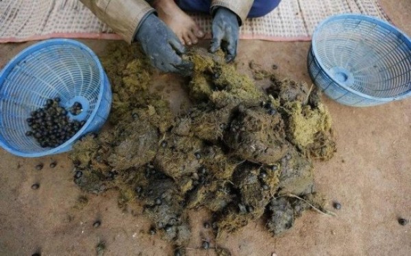 工作人员从象粪中收集咖啡豆,清洁后再加工,就成为美味的象粪咖啡。