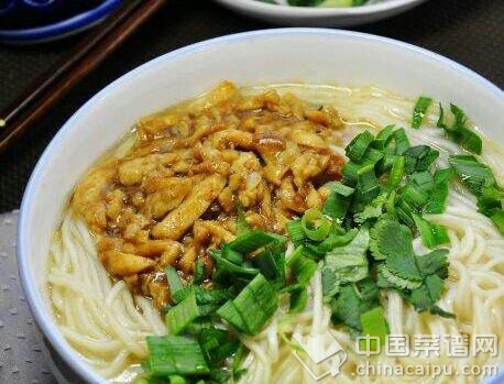 5、面滚开三次后,捞出,调入一点盐、舀入热面汤,将炒好的鸡肉放在面上,再撒上香菜和蒜苗,淋点香油,即可。