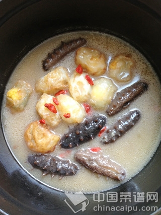 5 发好的海参将肠壁搓洗干净,用肉汤汆烫后取出,把海参放到鸡高汤中,加少许料酒、味极鲜、胡椒粉,小火煮约40分钟
