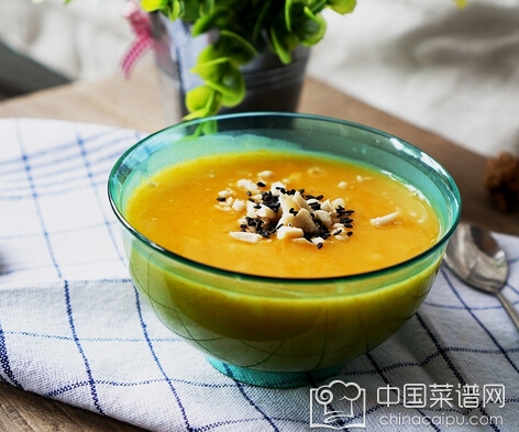 做法:将去皮切块的南瓜放入沸水中隔水蒸8~10分钟,然后将煮烂的南瓜压成面糊状。锅内加凉水,玉米粉、糯米粉放进后搅拌均匀,然后点火开煮,加冰糖,适时搅拌防止粘锅底。开锅将南瓜放入,继续搅拌至开锅,再煮个2~4分钟即可起锅。