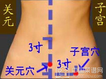 穴位位置:子宫穴位于下腹部,脐下一横掌处(脐下4寸)正中。左右旁开四横指(旁开正中线3寸)的距离各有一点即是此穴。