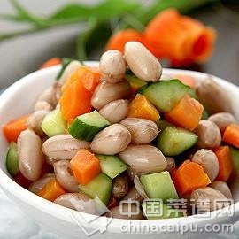 2、做法:把花生米放入加有十三香粉、盐、大料的水中煮熟,快熟的时候加入适量的冰糖,黄瓜、胡萝卜、西芹切成小段,焯一下和煮好的花生米搅拌均匀,滴几滴麻油即可。