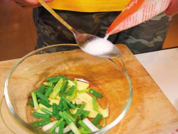 3 葱段、姜片倒进碗里,加入3汤匙油、2汤匙白糖一起搅匀,放入微波炉高火加热3分钟取出。