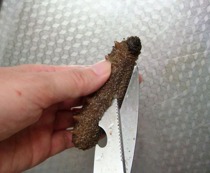 2、海参腹部中间有个自然的裂缝,沿此处上下剪开,上面那个圆形凸出的部分是海参的肛门,一并清理了,取出内筋和沙嘴,清洗海参肚内杂质。