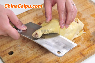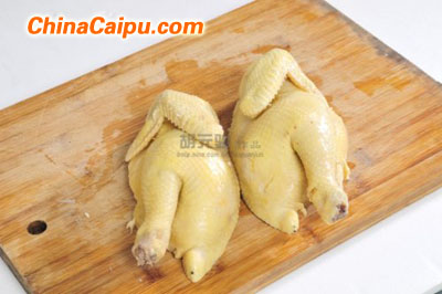 4、接下来我们要将鸡身部分一开为二,用力对开斩下即可。