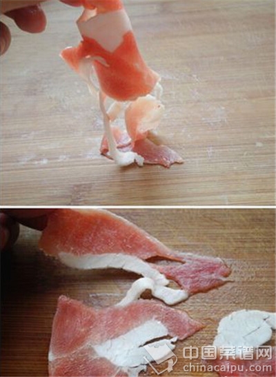 2、鉴别假羊肉最好的方法就是,把羊肉片化冻。化冻后的假羊肉片立刻就显出了原形,我们看一下下面这张图,化冻后的假羊肉红肉和白肉轻轻一碰就分开了,一看就不是自然长成的肉。